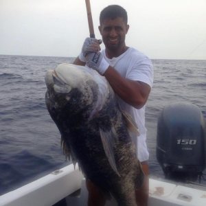 Another recent extremely interesting catch come from my friend Richard who runs Number One charters out of Maputo. On a deep bottom fishing outing last Saturday, the 4th of March they made a unique catch. Spending the day dropping between depths of 90 to 220 meters of water, they had great action with a number of good rosy jobfish, nice size groupers, red romans and then a fish that pulled real hard and come up as a BIG surprise. A Black Mussel Cracker (Cymatoceps Nasutus), the first we have ever heard caught in Mozambique (commercially or recreationally).