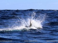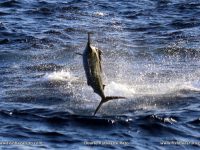 Well, we made it all the way out so we put the bait rods out and caught two bonnies straight away and baited them. The first one got sharked within the minutes. Ten minutes later we had another bite and this time a 250-pound Black started to jump. Gideon got in the chair and I followed the fish up sea which was no easy feat. But after some dancing around and some great jumps we got the fish by the boat, tagged it and let it go.
