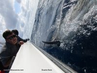 Despite having eased down it was still blowing a good 15 plus knots the next day but at least the waves where wider apart. We went north and again caught a bonnie and a skipjack straight away. We put the live bonnie out and the skipjack skipping right by the boat as a shark decoy. Within 10 minutes we had a hammerhead come on the skip bait which gave us enough time to take the live bait out put it in the tube and move away. Ten minutes later we slowly tacking out when a 300-pound fish shows up on the starboard of the boat, not 10 meters away. The fish then turns and comes behind out skip bait. Then it fades and comes hot on the live bonnie and as it furiously takes it the bridle breaks….something which I can´t remember having happen before. Really unlucky and everyone feeling a bit dejected as we went in to get another bait. We quickly got another 2 bonnies, put them out and within 15 minutes have a bite and hookup, this time to a 300-pound Black. The fish puts on a great series of jumps and then goes down and we see its tail wrapped. Sunset it and Ian quickly brings it in for the release. We then spent an hour looking for bait to no avail. That is, until we find a big school of YFT inside Nhangoose. We get a 8 kilo YFT, put it in the tube and head deeper. The bait was not in the water when we get a deep bite. No one see´s the fish and it never jumps, but despite being a slow tugger I am confident it´s a Marlin. Jaco gets in the chair, we put on the heat and when we get the fish very close to the boat she finally comes out the water, all 600 pounds of it and spits the bait back at us! We did not see another one but had amazing action for the rest of the day with YFT and skipjack, baited another 3 baits that got sharked and Jaco released a 400 pound Zambezi.