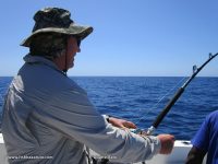 After having such a great day two days before our first day was very disappointing. Beautiful sunny calm conditons with a light breeze from the NE but the fish had switched off and despite there being at least 5 boats out there, it was slow for everyone, even the boats targeting light tackle game fish. We saw two Marlin, one `sunbathing`and a free jumper. We caught a bunch of tunas and had a few baits sharked and the highlight of the day was Jaco getting for the first ever time in the chair to release his a 250 pound bronzie.