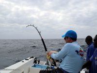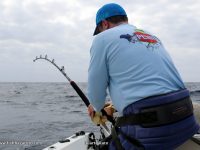 The second day we decided to run up north and after 2 hours of completely unproductive light tackle fishing we set the lures out. At 9h24 I had decided to do a deeper tack of a place I have caught some nice fish of Nhangosse. I spotted a large school of skipjack in just over 200 meters of water and as we got to them a bomb exploded on the short right Riggler by Pulsator and this mad 400-pound fish starts jumping towards the boat. Totally insane and really exciting for the guys, this fish just kept coming at us, never mind I was full throttles ahead this thing was just warping straight at us. We managed to stay attached as it then starting to greyhound away on our port side. Pretty wild stuff as this thing took us into the backing before we turned & chased. Simon was in the chair and brought the fish for a release in about twenty minutes! Hi-fives all round and of we go again. It was pretty quiet for us and all the other boats for the next two hours but finally at noon we managed to get two Yellowfin, first live bait out in 2 days and all it took was 20 minutes for the 8 kilo YFT to be gulped down by a 700-pound fish. Luckily, just after we caught the bait and seeing Simon did not look to comfortable in the chair, I did an all chair demonstration for the guys once again. Got stuff as now Nick climbed on it with a 700-pound fish at the other end. Truth be told he had to do more winding than pumping as this thing stayed on the top and we could actually get on top of it pretty quickly and at the 14-minute mark took hold of the leader for a release – unfortunately we no pics.