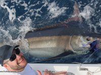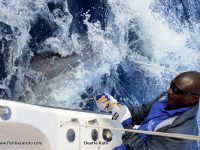 Only once before had I seen a big Black hookup and run at lighting speed straight down. That was a 1098 lbs we caught a few years ago. Well this fish did exactly the same, line straight down peeling at a serious pace and nowhere to turn! All of a sudden I see the line take an angle to the right so I start turning. Just then this bloody thing changes direction on the dime and starts coming up on the starboard side, I tell Nick to back it off all the way to 18 pounds when this very fat fish starts jumping insanely on the exact opposite side. Just chaos and three minutes to tame this thing and get everything under control. By then we were well into the backing and it was a long hard work for Nick to get it back. This thing did a few more jumps but still pretty far but I knew she was well over 800 for sure, maybe more! She then went down and just did not give us an inch. What a strong fish. Nick was looking really good in the chair and 15 minutes into it I told him to go to 60 pounds. Three times around the half an hour mark we had the double a couple meters from the rod tip but she would just not come up or jump. I knew this was a fighter and although it’s always good to take a few good pictures for the guys, the heath of the fish is more important if you gonna let it go. So, I had a quiet word with the boys and told them to hold for everything they had when we got the leader. 45 minutes into it she comes up and we turn and chase her really good. She then dug down a bit and started swimming. We reversed into her with the line on our port side and inch but inch she slowly come up. Nick was really looking like a pro now and withstanding the immense pressure. The double come up and eventually, Alberto got hold of the leader, we had a few good couple insane minutes of a genuine tug of war.
