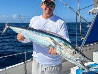 Tiffany, better known as the Queen of Wahoo, with yet another of many wahoo caught during the trip. Not to be outdone hubby Courtenay with a nice yet another. They were wild at times and we had multiple strikes and on the third day proper chaos as we had a quintuple strike and hooked four fish simultaneously!