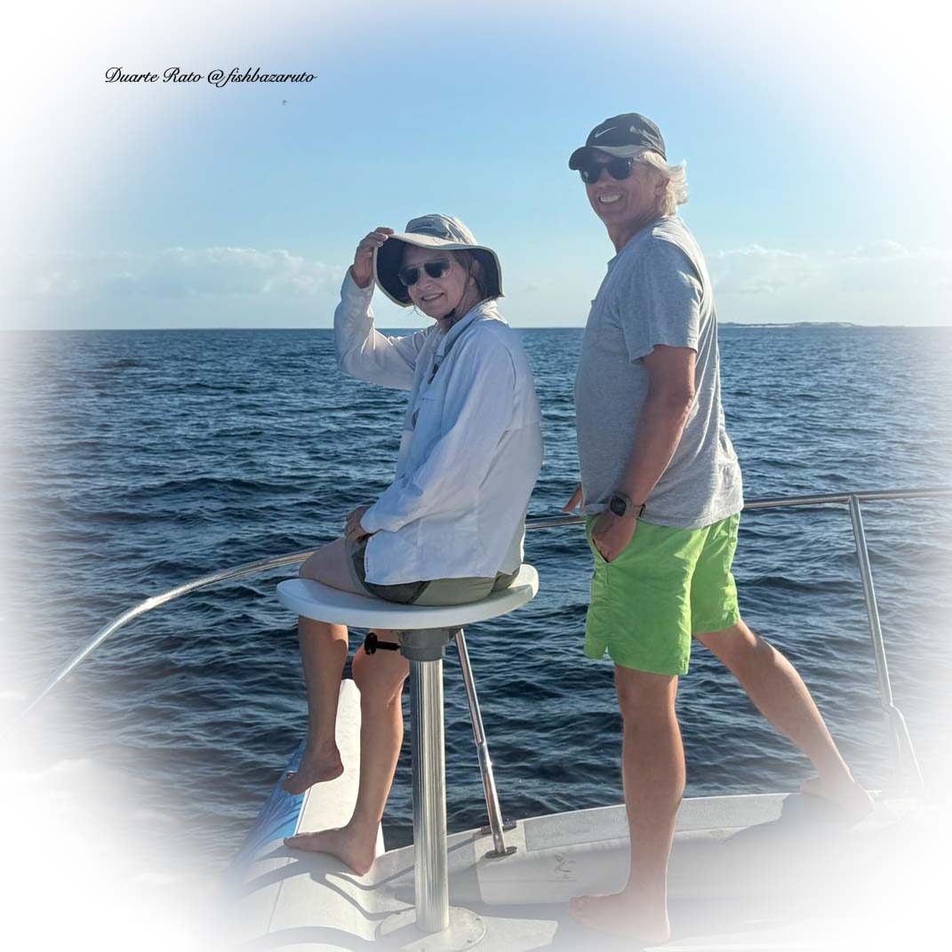 Bruce & Katherine Winston enjoying the breeze and calm seas on the bow of the 38ft SuperCat – Drop Your Rods!